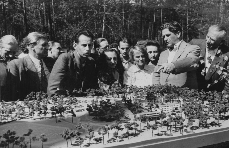 K. Klingner (Foto), Hans Jendretzky (Vorsitzender des Bundesvorstandes des FDGB) und der Architekt Georg Waterstradt (l.) am Modell der Erweiterungsbauten, 1950, Archiv baudenkmal bundesschule bernau e. V., © unbekannt