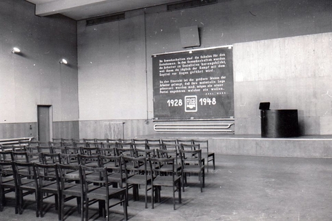 Anni Albers‘ Wandbehangstoff hing noch bis in die frühen 1950er-Jahre hinein – wenn auch schon stark zerschlissen – an den Wänden der Aula. Mit den Bestrebungen des damaligen Besitzers der Schule, dem Freien Deutschen Gewerkschaftsbund (FDGB), die Schulen zu einer Hochschule der Gewerkschaften weiterzuentwickeln und dem hiermit verbundenen wachsenden Platzmangel in dem für 120 Teilnehmer geplanten Gebäude, wurde die Aula zugunsten der Erweiterungen von Speisesaal, Küche und Garderobe aufgelöst. Erst mit der Sanierung der Bundesschule 2002 bis 2007 wurde die Aula wieder teilrekonstruiert. Die Feinsanierung, wie sie bereits in den meisten Räumen abgeschlossen ist, steht hier noch aus. Hierzu gehört sowohl der Silberstoff als auch die Holzvertäfelung, beides ist bisher lediglich farblich markiert und vorgemerkt. Das Gesamtbild der Aula – ein eigentlich von Licht erfüllter Raum mit verbesserter Akustik –, das momentan noch geboten wird, ist ein ganz anderes; es zeigt einen tristen Ort, an dem sich der Besucher fragen muss, warum die Sanierung ausgerechnet hier Halt gemacht hatte.