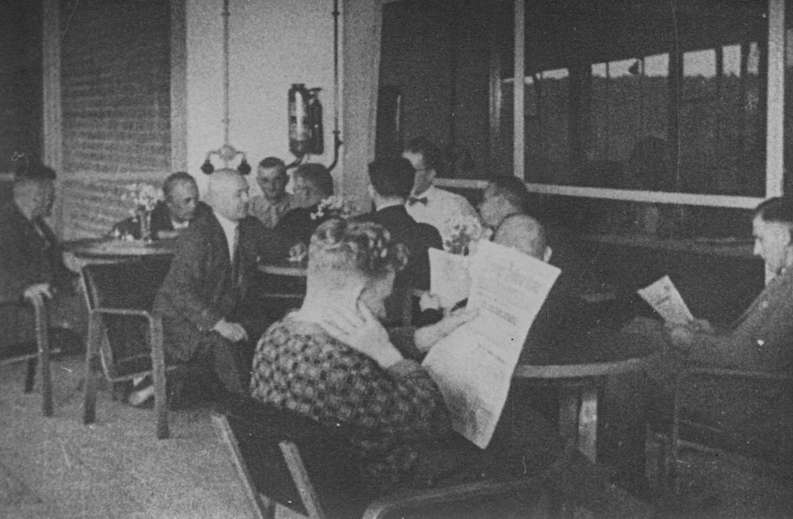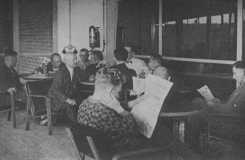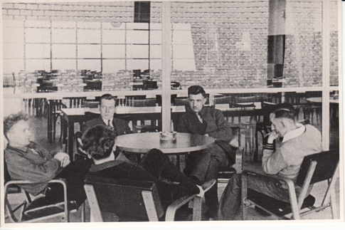 Auch im Aufenthaltsraum plante Wera Meyer-Waldeck ausschließlich eine Ausstattung mit Bauhaus-Mobiliar: Hocker, Stühle und Tische waren allesamt mit demselben Grundgestell versehen und variierten in ihrer Größe. Das Gestell geht auf einen Entwurf von Josef Albers für einen Teetisch von 1927 zurück: vier U-förmige Elemente mit abgerundeten Enden, von denen zwei kürzere für mehr Stabilität sorgten. Die runden Tische (auch in den Seminarräumen und in der Bibliothek der Bundesschule in größerer Dimension verwendet) sind ti 204 Klapptische, deren Tischplatten einklappbar und Füße zusammenschiebbar waren. Stühle und Hocker wurde alle – wie auch die ti 244 Armlehnsessel – mit braunem Leder bezogen und waren so einfach zu reinigen und robust.