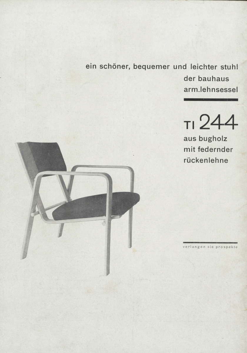 „Gebogenes Holz“, „federnde Rückenlehne“ und „Federpolster“ sind die Schlagworte, die den Armlehnstuhl mit der Nummer 244 der Bauhaus-Tischlerei (kurz ti) von Josef Albers auf seiner Reise durch die zahlreichen Ausstellungsorte der Bauhaus-Wanderausstellung 1929 bis 1930 begleiten. Auf einer Tafel befestigt, sollte die extrem einfache Zerlegbarkeit und der simple Aufbau des Stuhles und der damit verbundene platzsparende Transport des Möbels gleich auf den ersten Blick begreifbar werden. Albers nahm mit diesem Prinzip bereits vorweg, was IKEA-Möbel heute so beliebt macht. An einigen Ausstellungsorten wurde diese Demonstrationstafel durch ein aufgebautes Exemplar ergänzt; das Gesamtbild wurde so vervollständigt. Was sich hier nach einem Erfolg versprechenden Bauhaus-Design anhört, entwickelte sich mehr oder weniger zum Verkaufsflop. Die Herstellung erwies sich als zu aufwendig, sodass eine industrielle Massenproduktion nicht möglich war. Daher finden sich auch nur erhaltene Einzelstücke des ti 244 aus Privatnachlässen, die bis 1933 von der Berliner Firma J. C. Pfaff A. A. und Trunk & Co. produziert worden waren. Der ti 244 ist ein Armlehnstuhl, der mit dem großen Vorhaben konstruiert wurde, den Sprung von den teuren Stahlrohrmöbeln Marcel Breuers zum „Volksstuhl“ für jedermann zu schaffen; er scheiterte allerdings an seinen ehrgeizigen Ambitionen. Dass der ti 244 auch in der Bundesschule – in einem öffentlichen Gebäude – als Teil einer Sitzgruppe stand, war bisher allerdings kaum bekannt.