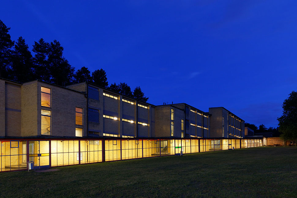 The distinctive entrance area from 1930, featuring a cantilevered roof, glass-brick sidewall, three towering chimneys, and a single-story structure in front, was entirely concealed behind a two-story, red-brick structure built during expansions to the Trade Union School in 1952–1953. The original 1930 entrance and access to the school building was recreated by opening it up again during renovations, thus preserving the building’s various historical layers.