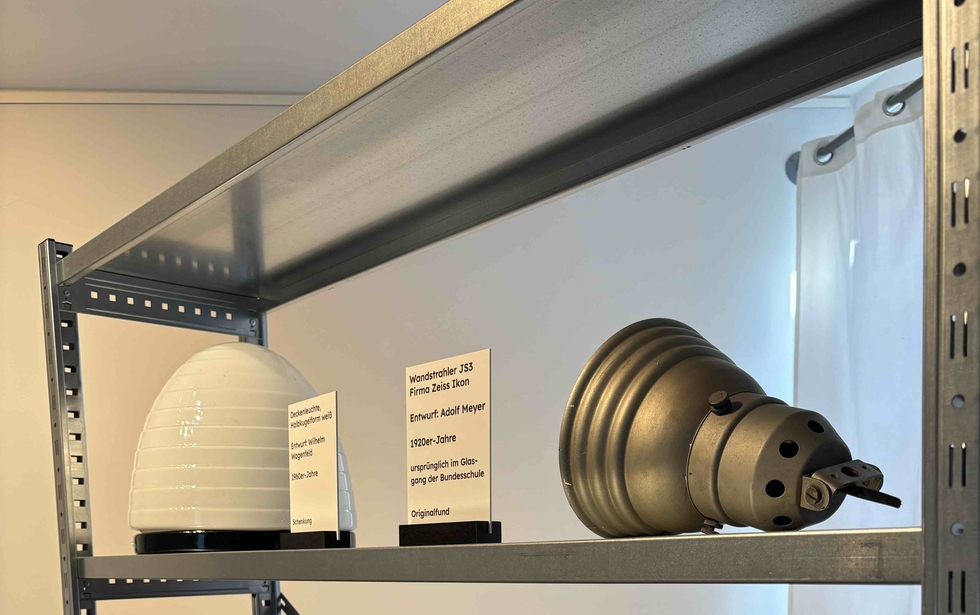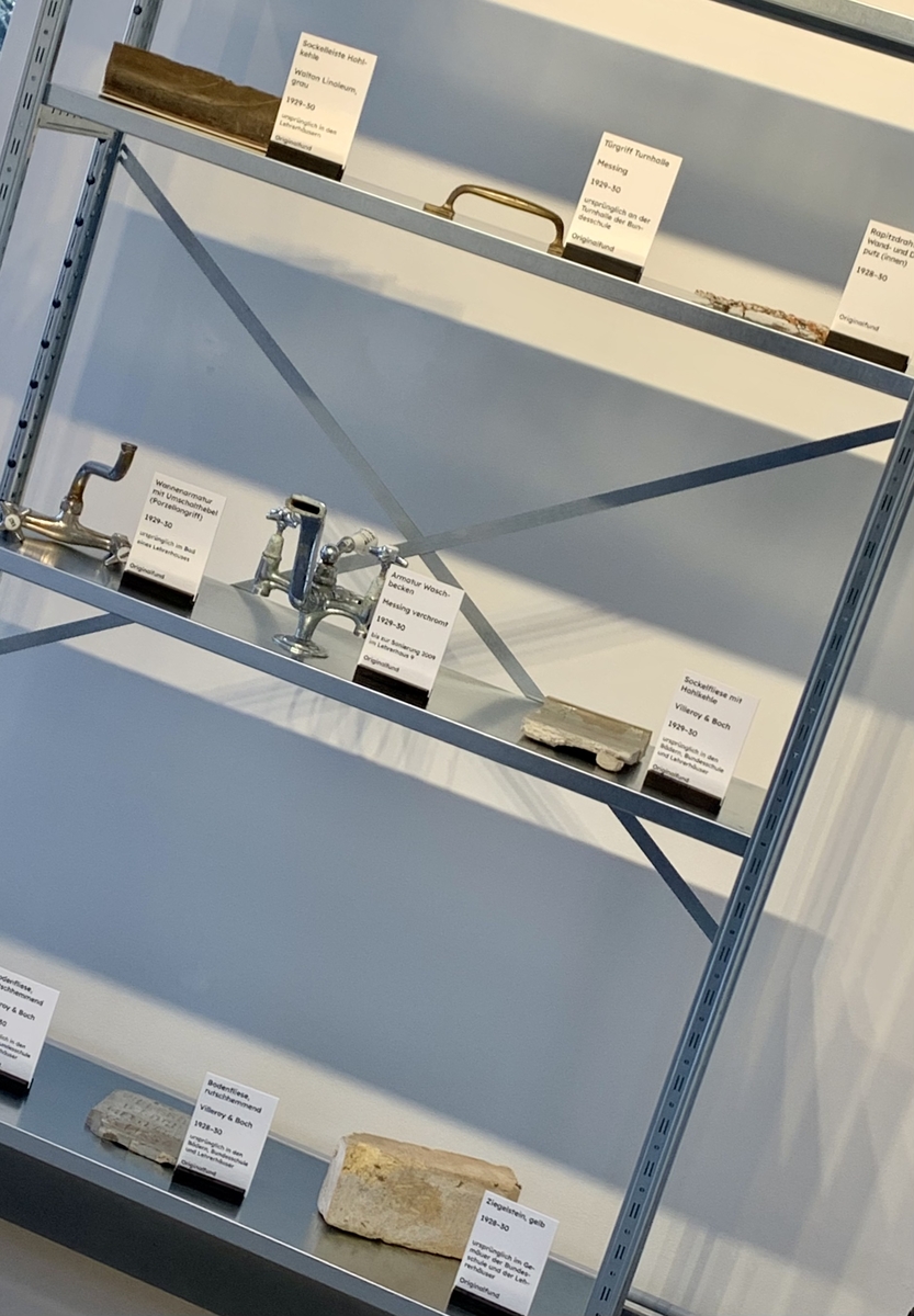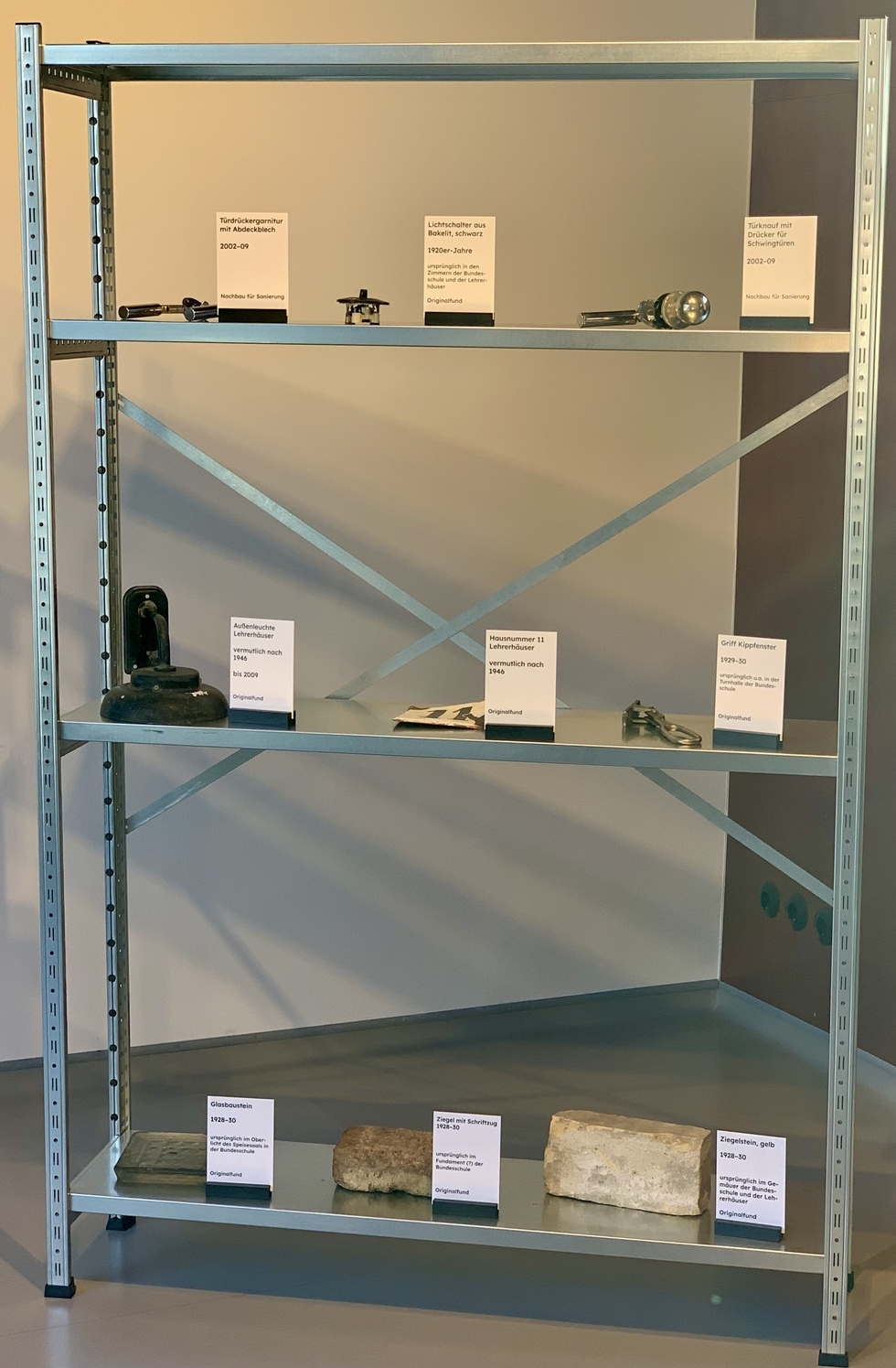 Mit dem Zwischenspiel "Blick ins Archiv" möchte der Verein baudenkmal bundesschule bernau seinen Gästen einen Blick in die eigenen Archivregale gewähren. In jedem unserer drei Ausstellungsräume finden Sie derzeit ein Archivregal mit Originalobjekten, die vor Ort während der Sanierungsarbeiten gefunden oder angekauft bzw. gespendet wurden. Es handelt sich dabei zum Beispiel um Bauhauslampen, Türgriffe, Badarmaturen und die originale Turnhallenuhr der Bundesschule.